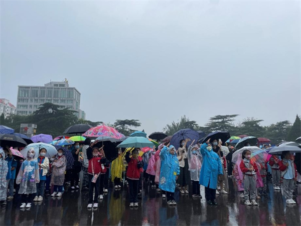 上午九時,活動正式開始。由講解員組成的國旗護衛(wèi)隊英姿颯爽,在莊嚴的國歌聲中。邁著鏗鏘的步伐走向國旗臺,現(xiàn)場群眾列隊目送五星紅旗,雨滴打在護衛(wèi)隊員和現(xiàn)場觀眾的臉上、身上,也激燃著大家炙熱、濃烈的愛國情懷,眾人齊聲高唱國歌,場面莊重,令人動容。隊伍中有許多少年兒童,風雨中孩子們稚嫩的臉龐上掛著雨滴,但沒有人提前離開,他們目光堅毅,揮舞國旗,認真地跟在家長身旁,迎國旗、唱國歌,展現(xiàn)出中國少年不懼風雨、胸懷祖國、勇于擔當?shù)闹練狻⒐菤狻?/span>