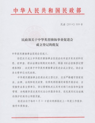 2014年7月22日,國務(wù)院批準(zhǔn)成立中華英烈褒揚(yáng)事業(yè)促進(jìn)會(huì)。其根本宗旨是:“傳承英烈志,凝聚民族魂,共圓中國夢”。中華英烈褒揚(yáng)事業(yè)促進(jìn)會(huì)是由軍內(nèi)外多名老將軍、老領(lǐng)導(dǎo)和李大釗烈士陵園、濟(jì)南革命烈士陵園、抗美援朝烈士陵園、撫順市雷鋒紀(jì)念館等單位發(fā)起的,從2013年8月份開始籌組,同年12月31日,民政部黨組研究通過成立中華英烈褒揚(yáng)事業(yè)促進(jìn)會(huì)的議案。2014年1月1日籌備組進(jìn)入北京市西城區(qū)景山西街48號(hào)甲辦公。5月29日,民政部向國務(wù)院上報(bào)關(guān)于成立中華英烈褒揚(yáng)事業(yè)促進(jìn)會(huì)的請示。6月11日,民政部辦公廳向外交部發(fā)函征求中華英烈褒揚(yáng)事業(yè)促進(jìn)會(huì)籌備成立登記意見。7月3日,國務(wù)委員王勇在民政部《關(guān)于中華英烈褒揚(yáng)事業(yè)促進(jìn)會(huì)籌備成立的請示》上批示:報(bào)請萬全同志批示。
